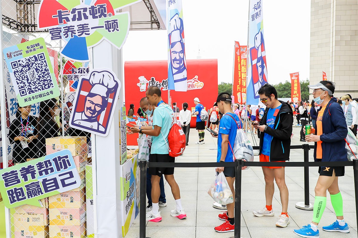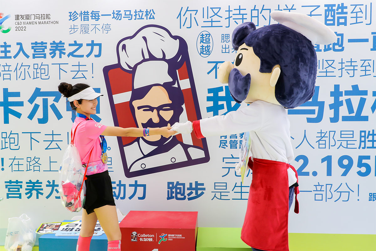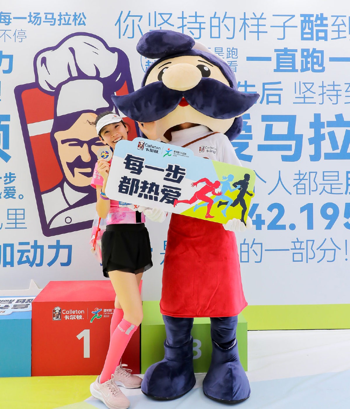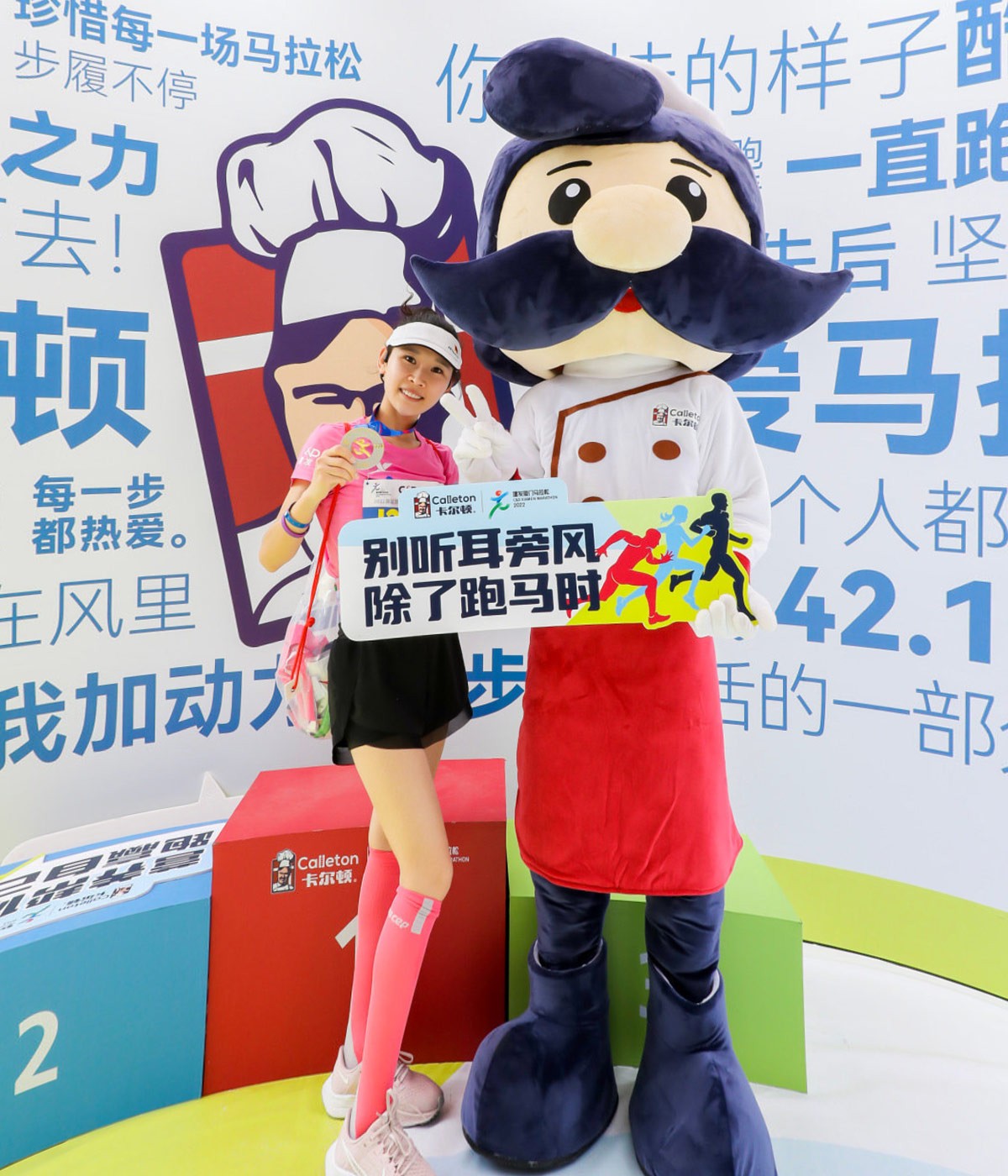 现场的跑者小姐姐与卡尔顿ip人偶热情互动