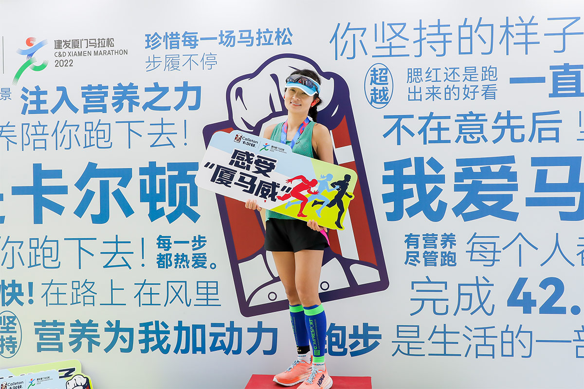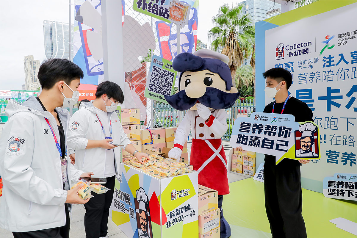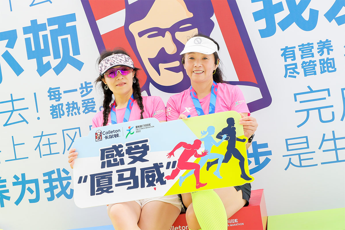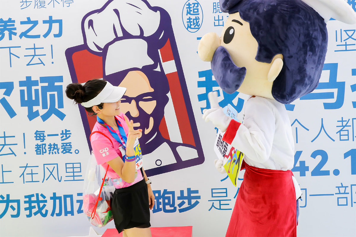 现场的跑者小姐姐与卡尔顿ip人偶热情互动