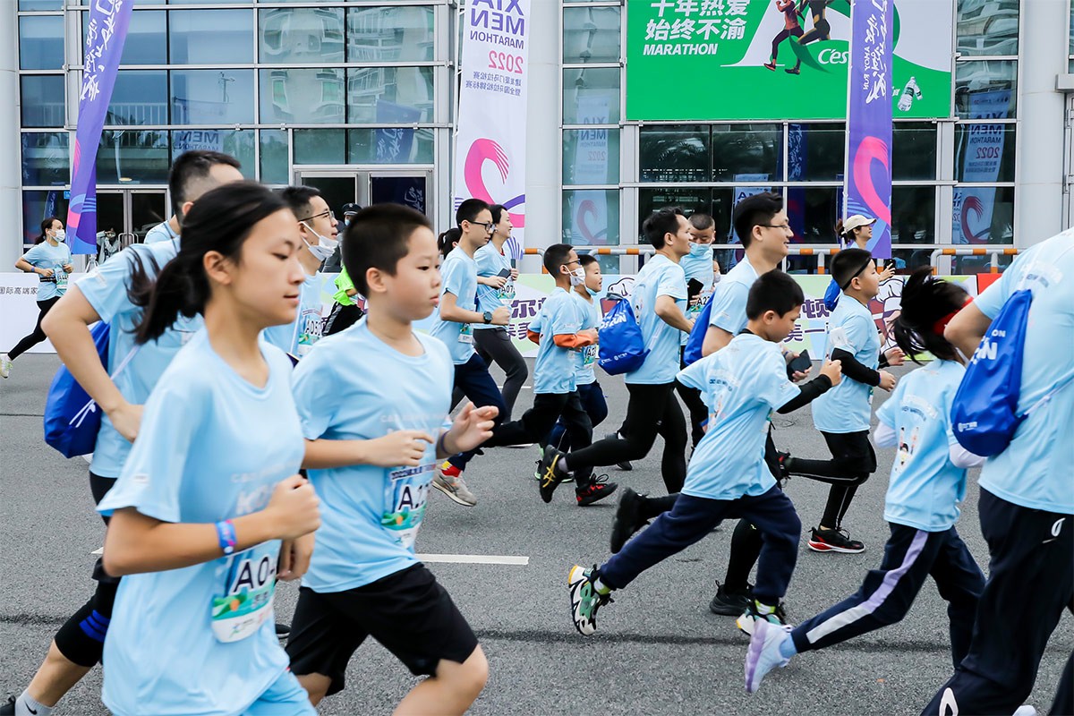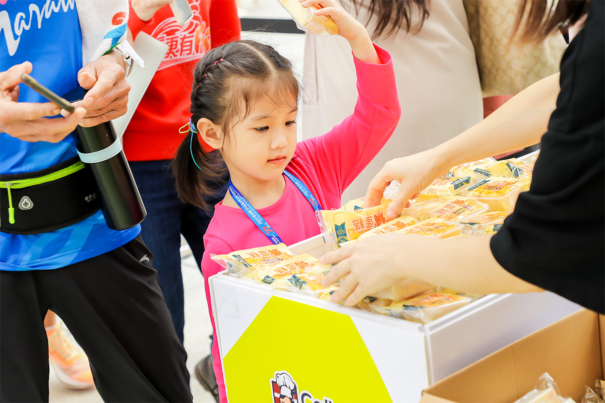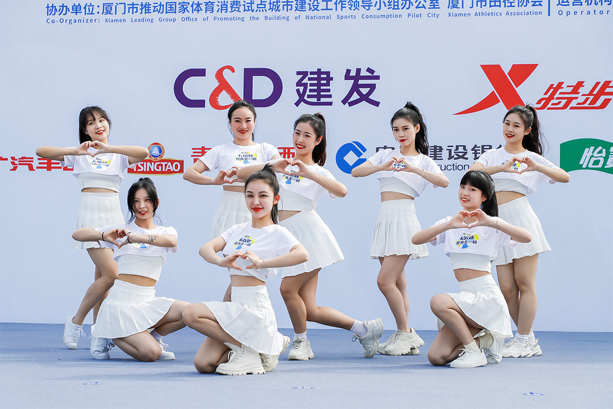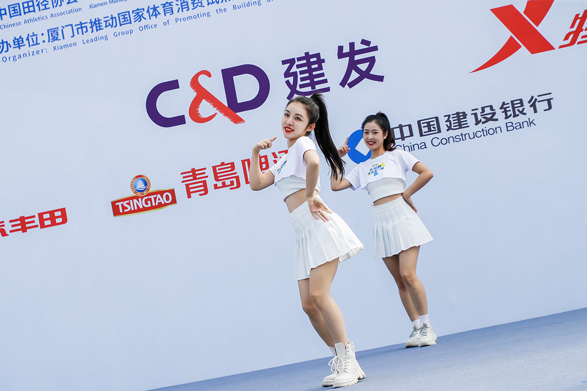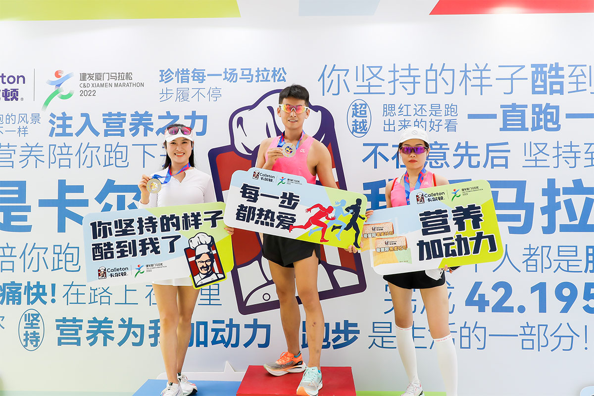 现场的跑者小姐姐与卡尔顿ip人偶热情互动